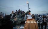 Warga Suriah merayakan kedatangan pejuang oposisi di Damaskus, Suriah, Ahad (8/12/2024). Kekuasaan Partai Baath di Suriah tumbang pada Ahad (8/12/2024). Hal itu ditandai ibu kota Damaskus lepas dari kendali rezim Presiden Bashar al-Assad. Runtuhnya kekuatan pasukan Assad di ibu kota mengakhiri 61 tahun pemerintahan Partai Baath yang penuh kekerasan dan 53 tahun kekuasaan keluarga Assad. (FOTO : AP Photo/Omar Sanadiki)