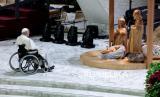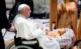 Paus Fransiskus melihat instalasi Bintang Betlehem yang menampilkan patung bayi Yesus mengenakan keffiyeh Palestina di Aula Paulus VI Vatikan, Sabtu (7/12/2024). Instalasi ini dirancang oleh seniman Palestina Johny Andonia dan Faten Nastas Mitwasi yang berasal dari Bethlehem, Palestina. Keffiyeh Palestina dipandang sebagai simbol nasional dan merupakan simbol perjuangan melawan pendudukan Israel. (FOTO : REUTERS/Remo Casilli )