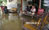 Warga duduk di teras rumah sambil bekerja saat banjir mengenangi Dusun Beluk, Desa Jombok, Kecamatan Kesamben, Kabupaten Jombang, Jawa Timur, Senin (9/12/2024). Dari data BPBD Kabupaten Jombang, banjir akibat luapan sungai Afvour Watudakon itu merendam ratusan rumah dengan ketinggian bervariasi mulai 30 sentimeter hingga 60 sentimeter, selain itu sebanyak 600 jiwa terdampak serta 55 orang mengungsi ke tempat aman. (FOTO : ANTARA FOTO/Syaiful Arif)