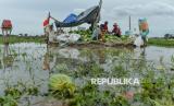 Menurut petani setempat, mereka terpaksa memanen semangka sebanyak lima ton karena lahannya terendam banjir.