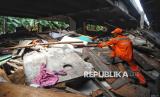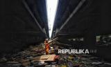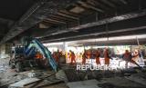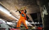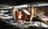 Petugas membersihkan bekas hunian semi permanen di kolong Tol Angke, Jalembar Baru, Jakarta, Rabu (11/12/2024). Sebanyak 600 personel gabungan dikerahkan untuk pembersihan bekas kawasan pemukiman ilegal tersebut yang warganya kini direlokasi ke Rusun Daan Mogot, Rusun Rawabuaya, Rusun Tegal Alur dan Rusun PIK Pulogadung. Para petugas melakukan membersihkan lapak dengan merobohkannya terlebih dahulu. Kemudian sisa-sisa lapak dikumpulkan untuk kemudian diangkut menuju tempat pembuangan.Pemkot Jakarta Barat berencana menyediakan sejumlah fasilitas publik di lokasi tersebut setelah area ini rampung dibersihkan dari lapak-lapak dan hunian ilegal warga. (FOTO : Republika/Prayogi)