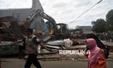 Warga melintas saat pembongkaran kios pedagang di jalan Merdeka, Kota Bogor, Jawa Barat, Kamis (12/12/2024). Sebanyak 43 kios semi permanen dipinggir jalan tersebut dibongkar petugas Satpol PP Kota Bogor karena tidak memiliki izin usaha atau ilegal dan menjadi sumber kemacetan dan kekumuhan. (FOTO : ANTARA FOTO/Arif Firmansyah)