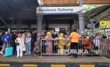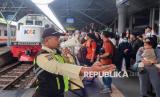 REPUBLIKA.CO.ID, SURABAYA Petugas mengarahkan calon penumpang menuju gerbong kereta api di Stasiun Gubeng, Surabaya, Jawa Timur, Sabtu (14/12/2024).