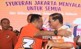 Calon Gubernur DKI Jakarta Pramono Anung (kanan) dan calon Wakil Gubernur DKI Jakarta Rano Karno berpelukan dalam acara syukuran kemenangan dalam Pilkada DKI Jakarta di Rumah Bersama Relawan (RBR) Mas Pram-Bang Doel, Jakarta, Sabtu (14/12/2024). KPU Jakarta telah menetapkan hasil Pilkada yang menyatakan calon dari PDIP Pramono-Rano tersebut meraih suara terbanyak yakni 2.183.239 atau 50,07 persen suara. (FOTO : ANTARA FOTO/Reno Esnir)