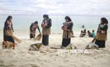 Sejumlah warga mengenakan busana hasil daur ulang sampah plastik saat membersihkan pantai Tanjung Waka, Kepulauan Sula, Maluku Utara, Sabtu (14/12/2024). Aksi bersih sampah tersebut sebagai bentuk edukasi kepada pengunjung Festival Tanjung Waka untuk tidak membuang sampah di sekitar pantai serta mengajak masyarakat setempat agar meningkatkan kepedulian terhadap lingkungan yang bersih dan sehat. (FOTO : ANTARA FOTO/Andri Saputra)