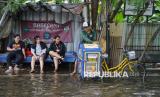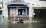 Anak-anak bermain saat banjir rob melanda di Kawasan Pluit Karang Ayu Barat, Jakarta, Senin (16/12/2024). Banjir luapan air laut atau rob tersebut menggenangi salah satu akses jalan untuk memasuki kawasan pelabuhan Muara Angke. Banjir rob dikawasan tersebut mencapai ketinggian sekitar 10 hingga 60 sentimeter (cm) yang berakibat aktivitas warga di sekitar menjadi terhambat. Menurut informasi sudah empat hari banjir rob merendam beberapa tempat di wilayah Jakarta Utara. Sebelumnya Badan Meteorologi Klimatologi dan Geofisika telah mengeluarkan peringatan dini banjir rob pada pada tanggal 11 Desember - 20 Desember 2024. (FOTO : Republika/Prayogi)