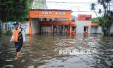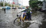 Pedagang roti melintasi banjir rob di Kawasan Pluit Karang Ayu Barat, Jakarta, Senin (16/12/2024). Banjir luapan air laut atau rob tersebut menggenangi salah satu akses jalan untuk memasuki kawasan pelabuhan Muara Angke. Banjir rob dikawasan tersebut mencapai ketinggian sekitar 10 hingga 60 sentimeter (cm) yang berakibat aktivitas warga di sekitar menjadi terhambat. Menurut informasi sudah empat hari banjir rob merendam beberapa tempat di wilayah Jakarta Utara. Sebelumnya Badan Meteorologi Klimatologi dan Geofisika telah mengeluarkan peringatan dini banjir rob pada pada tanggal 11 Desember - 20 Desember 2024. (FOTO : Republika/Prayogi)