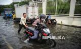 Pengendara kendaraan bermotor melintasi banjir rob di Kawasan Pluit Karang Ayu Barat, Jakarta, Senin (16/12/2024). Banjir luapan air laut atau rob tersebut menggenangi salah satu akses jalan untuk memasuki kawasan pelabuhan Muara Angke. Banjir rob dikawasan tersebut mencapai ketinggian sekitar 10 hingga 60 sentimeter (cm) yang berakibat aktivitas warga di sekitar menjadi terhambat. Menurut informasi sudah empat hari banjir rob merendam beberapa tempat di wilayah Jakarta Utara. Sebelumnya Badan Meteorologi Klimatologi dan Geofisika telah mengeluarkan peringatan dini banjir rob pada pada tanggal 11 Desember - 20 Desember 2024. (FOTO : Republika/Prayogi)