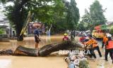Petugas gabungan memotong pohon tumbang yang menghalangi jalan saat terjadi banjir di Ponorogo, Jawa Timur, Senin (16/12/2024). Banjir akibat luapan sejumlah sungai dan jebolnya tanggul mengakibatkan tujuh wilayah kecamatan di daerah itu terendam, dua warga tewas terseret arus banjir, ratusan warga mengungsi, sejumlah ruas jalan dan ratusan rumah terendam, serta beberapa sekolah diliburkan. (FOTO : ANTARA FOTO/Siswowidodo)