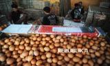 Pedagang memilah telur di pasar Rawamangun, Jakarta, Selasa (17/12/2024). Pedagang mengakui harga telur ayam negeri mengalami kenaikan sejak sepekan terakhir. Saat ini  harga telur ditempat tersebut mencapai Rp 31.000 per kilogram. Padahal sepekan sebelumnya masih diharga Rp. 26.000 per kilogram. Menurut pedagang kemungkinan harga telur akan kembali normal setelah tahun baru. Banyak konsumen yang mengeluh akan kenaikan harga telur tersebut terutama dari kalangan ibu rumah tangga. (FOTO : Republika/Prayogi)