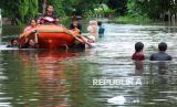 Tim SAR melakukan penyisiran di area permukiman warga yang terendam banjir di Perumnas Antang, Kelurahan Manggala, Makassar, Sulawesi Selatan, Ahad (22/12/2024). Ratusan rumah warga di tiga kecamatan di daerah tersebut terendam banjir akibat hujan dengan intensitas tinggi dan sedikitnya 1.551 jiwa mengungsi yang tersebar di 27 titik pengungsian. (FOTO : ANTARA FOTO/Arnas Padda)