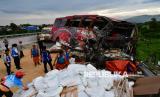 Sejumlah petugas melakukan proses evakuasi bus pariwisata yang terlibat kecelakaan di KM 77+200 Jalan Tol Pandaan-Malang, Lawang, Kabupaten Malang, Jawa Timur, Senin (23/12/2024). Berdasarkan data temuan awal Polres Malang, kecelakaan bus pariwisata dan truk tersebut menyebabkan empat orang meninggal dunia. (FOTO : ANTARA FOTO/Ahmad Prabowo)