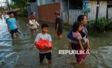 Warga membawa bantuan logistik ke posko pengungsian di Kecamatan Manggala, Makassar, Sulawesi Selatan, Selasa (24/12/2024). Badan Penanggulangan Bencana Daerah (BPBD) Makassar mencatat sebanyak 2.551 orang warga mengungsi di 34 lokasi yang tersebar di empat kecamatan akibat banjir bandang di daerah tersebut. (FOTO : ANTARA FOTO/Hasrul Said)