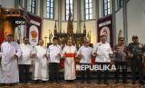 Menteri Koordinator Bidang Politik dan Keamanan Budi Gunawan (ketiga kanan), Menteri Koordinator Bidang Pembangunan Manusia dan Kebudayaan Pratikno (keempat kanan), Menteri Agama Nasaruddin Umar (keempat kiri), dan pemangku kepentingan lainnya bergandeng tangan saat meninjau pengamanan di Gereja Katedral, Jakarta, Selasa (24/12/2024). Peninjauan langsung tersebut guna memastikan rangkaian perayaan Natal berjalan lancar, aman, dan damai. (FOTO : ANTARA FOTO/Muhammad Ramdan)