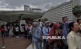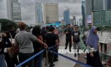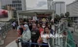 Pengunjung mengantre untuk bergantian berfoto di anjungan Halte Bundaran Hotel Indonesia, Jakarta, Rabu (25/12/2024). Pada masa libur Natal dan Tahun Baru 2024-2025, sejumlah warga memanfaatkan waktunya untuk berlibur menikmati lanskap perkotaan dan berswafoto di anjungan Halte Bundaran HI. Keberadaan anjungan Halte Bundaran HI tersebut menjadi destinasi wisata alternatif di Jakarta yang memiliki daya tarik tersendiri dengan menyajikan spot foto dengan latar belakang patung Selamat Datang dan lanskap Perkotaan. Selain itu, di halte tersebut juga menyediakan beragam kuliner dan fasilitas lainnya seperti musala dan toilet untuk memberikan kenyamanan bagi para pengunjung. Bagi warga yang hendak berwisata di halte tersebut, cukup menempelkan Kartu Uang Elektronik (KUE) di mesin pintu masuk seperti penumpang bus transjakarta lainnya. (FOTO : Republika/Thoudy Badai)
