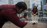 Pengunjung berswafoto di anjungan Halte Bundaran Hotel Indonesia, Jakarta, Rabu (25/12/2024). Pada masa libur Natal dan Tahun Baru 2024-2025, sejumlah warga memanfaatkan waktunya untuk berlibur menikmati lanskap perkotaan dan berswafoto di anjungan Halte Bundaran HI. Keberadaan anjungan Halte Bundaran HI tersebut menjadi destinasi wisata alternatif di Jakarta yang memiliki daya tarik tersendiri dengan menyajikan spot foto dengan latar belakang patung Selamat Datang dan lanskap Perkotaan. Selain itu, di halte tersebut juga menyediakan beragam kuliner dan fasilitas lainnya seperti musala dan toilet untuk memberikan kenyamanan bagi para pengunjung. Bagi warga yang hendak berwisata di halte tersebut, cukup menempelkan Kartu Uang Elektronik (KUE) di mesin pintu masuk seperti penumpang bus transjakarta lainnya. (FOTO : Republika/Thoudy Badai)