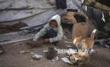 Seorang anak Gaza bermain dengan kucing di samping tenda keluarganya, yang terbuat dari potongan kain dan nilon, di sebuah kamp pengungsi Palestina di tepi pantai di Deir al-Balah, Jalur Gaza tengah, Jumat (27/12/2024). Anak-anak Gaza yang tinggal di dalam tenda pengungsian hidup dengan penuh keterbatasan. Mereka harus menghadapi ancaman hawa dingin dan keterbatasan pasokan makanan. Tenda-tenda yang dibangun seadanya tidak melindungi mereka sepenuhnya dari hawa dingin. Agresi Israel ke Palestina telah membuat 90 persen warga Gaza mengungsi dan tinggal di kamp pengungsian. (FOTO : AP Photo/Abdel Kareem Hana)