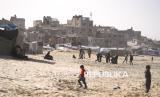 Anak-anak bermain di kamp pengungsi Palestina di tepi pantai di Deir al-Balah, Jalur Gaza tengah, Jumat (27/12/2024). Anak-anak Gaza yang tinggal di dalam tenda pengungsian hidup dengan penuh keterbatasan. Mereka harus menghadapi ancaman hawa dingin dan keterbatasan pasokan makanan. Tenda-tenda yang dibangun seadanya tidak melindungi mereka sepenuhnya dari hawa dingin. Agresi Israel ke Palestina telah membuat 90 persen warga Gaza mengungsi dan tinggal di kamp pengungsian. (FOTO : AP Photo/Abdel Kareem Hana)