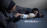 Seorang ibu mengganti pakaian putrinya yang berusia lima tahun, yang menderita kekurangan gizi, di tempat penampungan tempat mereka tinggal di Deir el-Balah, Jalur Gaza, Selasa (24/12/2024). Krisis pangan membuat anak-anak Gaza menghadapi persoalan malnutrisi. Bayi yang baru lahir menghadapi risiko lebih tinggi karena malnutrisi pada ibu mengurangi kualitas ASI yang dapat mereka berikan. PBB melaporkan lebih dari 50 ribu anak-anak di Gaza kekurangan gizi. (FOTO : Majdi Fathi/NurPhoto)