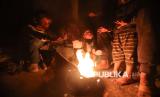 Anak-anak berkumpul di sekitar api unggun untuk menghangatkan diri di kamp pengungsi Palestina di tepi pantai di Deir al-Balah, Jalur Gaza tengah, Jumat (27/12/2024). Anak-anak Gaza yang tinggal di dalam tenda pengungsian hidup dengan penuh keterbatasan. Mereka harus menghadapi ancaman hawa dingin dan keterbatasan pasokan makanan. Tenda-tenda yang dibangun seadanya tidak melindungi mereka sepenuhnya dari hawa dingin. Agresi Israel ke Palestina telah membuat 90 persen warga Gaza mengungsi dan tinggal di kamp pengungsian. (FOTO : Majdi Fathi/NurPhoto)