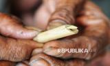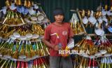 Pedagang terompet Rojali (50) menunjukkan pipet suara terompet saat menyelesaikan pembuatan terompet yang akan di jual di kawasan di Jalan Pintu Besar Selatan, Glodok, Jakarta, Sabtu (28/12/2024). Menjelang akhir tahun, para pengrajin sekaligus penjual terompet musiman mulai berdatangan dikawasan tersebut. Salah seorang pengrajin terompet asal Cikarang yaitu Rojali sudah berjualan terompet musiman di tempat itu sejak 20 tahun lalu. (FOTO : Republika/Prayogi)