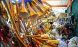 Pembeli memilih terompet yang di jual di kawasan di Jalan Pintu Besar Selatan, Glodok, Jakarta, Sabtu (28/12/2024). Menjelang akhir tahun, para pengrajin sekaligus penjual terompet musiman mulai berdatangan dikawasan tersebut. (FOTO : Republika/Prayogi)
