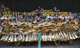 Deretan terompet yang di jual di kawasan di Jalan Pintu Besar Selatan, Glodok, Jakarta, Sabtu (28/12/2024). Menjelang akhir tahun, para pengrajin sekaligus penjual terompet musiman mulai berdatangan dikawasan tersebut. Harga terompet dijual berkisar dari Rp 5.000 hingga Rp 15.000 tergantung ukuran. Biasanya pedagang menerima pesanan mulai dari hotel, cafe, perusahaan hingga perorangan. (FOTO : Republika/Prayogi)