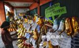 Pedagang terompet Rojali (50) menata terompet yang di jual di kawasan di Jalan Pintu Besar Selatan, Glodok, Jakarta, Sabtu (28/12/2024). Harga terompet yang Rojali jual berkisar dari Rp 5.000 hingga Rp 15.000 tergantung ukuran. Biasanya dia menerima pesanan mulai dari hotel, cafe, perusahaan hingga perorangan. (FOTO : Republika/Prayogi)