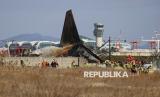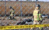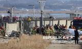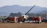 REPUBLIKA.CO.ID, MUAN -- Petugas pemadam kebakaran dan anggota tim penyelamat melakukan evakuasi di dekat puing-puing pesawat penumpang Jeju Air 7C2216 di Bandara Internasional Muan di Muan, Korea Selatan, Ahad (29/12/2024).