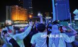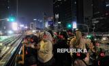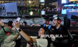 Wisatawan berswafoto saat mengikuti tur dengan menaiki bus Transjakarta atap terbuka di Jalan Jenderal Sudirman, Jakarta, Ahad (29/12/2024). Wisata bus tingkat Open Top Tour ini merupakan program terbaru PT Transportasi Jakarta (Transjakarta) guna mengenalkan kota Jakarta kepada wisatawan dengan sensasi mengelilingi pusat kota menggunakan bus atap terbuka. Selain dapat menikmati lanskap gedung pencakar langit, wisatawan juga dapat penjelasan mengenai sejarah Kota Jakarta dari pemandu wisata dengan menggunakan headphone. Rute bus tersebut berawal dari Ratu Plaza Mal, Jalan Jenderal Sudirman, Bundaran Hotel Indonesia, Jalan MH Thamrin, Patung Arjuna Wijaya lalu kembali ke Ratu Plaza Mal. Dalam sekali tur, bus wisata ini dapat mengangkut sebanyak 30 penumpang dengan tarif per orang Rp50 ribu dari harga normal Rp100 ribu.Bus tingkat tanpa atap ini merupakan salah satu alternatif destinasi wisata di Jakarta untuk mengisi waktu hari libur. (FOTO : Republika/Thoudy Badai)