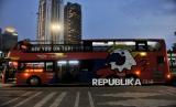 Bus Transjakarta atap terbuka terparkir di depan Ratu Plaza Mal, Jalan Jenderal Sudirman, Jakarta, Ahad (29/12/2024). Wisata bus tingkat Open Top Tour ini merupakan program terbaru PT Transportasi Jakarta (Transjakarta) guna mengenalkan kota Jakarta kepada wisatawan dengan sensasi mengelilingi pusat kota menggunakan bus atap terbuka. Selain dapat menikmati lanskap gedung pencakar langit, wisatawan juga dapat penjelasan mengenai sejarah Kota Jakarta dari pemandu wisata dengan menggunakan headphone. Rute bus tersebut berawal dari Ratu Plaza Mal, Jalan Jenderal Sudirman, Bundaran Hotel Indonesia, Jalan MH Thamrin, Patung Arjuna Wijaya lalu kembali ke Ratu Plaza Mal. Dalam sekali tur, bus wisata ini dapat mengangkut sebanyak 30 penumpang dengan tarif per orang Rp50 ribu dari harga normal Rp100 ribu.Bus tingkat tanpa atap ini merupakan salah satu alternatif destinasi wisata di Jakarta untuk mengisi waktu hari libur. (FOTO : Republika/Thoudy Badai)