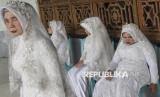 Sejumlah pengantin tuna netra menunggu pasangannya saat berlangsungnya nikah massal tuna netra se-Priangan Timur di Gedung Aisyah, Kota Tasikmalaya, Jawa Barat, Selasa (31/12/2024). Pernikahan massal gratis yang diikuti lima pasangan pengantin tuna netra itu untuk membantu para penyandang disabilitas yang tidak mampu secara ekonomi dalam mendapatkan legalitas secara hukum negara. (FOTO : ANTARA FOTO/Adeng Bustomi)