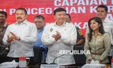Menko Bidang Politik dan Keamanan Budi Gunawan bersama Jaksa Agung ST. Burhanuddin bersiap memberikan keterangan pers bersama terkait capaian kinerja Desk Koordinasi Pencegahan Korupsi dan Perbaikan Tata Kelola dan Desk Koordinasi Peningkatan Penerimaan Devisa Negara di Kejaksaan Agung, Jakarta, Kamis (2/1/2025). Dalam kesempatan tersebut Menkopolkam Budi Gunawan menjelaskan bahwa dalam tiga bulan terakhir desk pencegahan korupsi telah menyelamatkan Rp6,7 triliun dan akan fokus pada pemulihan aset korupsi di luar negeri untuk mendukung pembangunan nasional serta meningkatkan kesejahteraan masyarakat. (FOTO : Republika/Prayogi)
