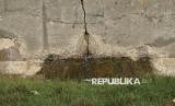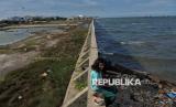 Air laut keluar dari tanggul yang retak di pesisir Muara Baru, Jakarta Utara, Jumat (3/1/2024). Wijaya (30) salah satu warga kampung Muara Baru menuturkan, pasalnya pada sekitar tahun 2002, kondisi pemukimannya berbada sekitar 35 meter dari bibir pantai sebelum dibangun tanggul, Namun, setiap tahun kondisi air laut naik dan permukaan tanah mengalami penurunan. Wijaya mengaku khawatir terkait turunnya permukaan air tanah tersebut. Sementara menurut Menteri Lingkungan Hidup Hanif Faisol Nurofiq mengatakan penurunan permukaan air tanah di Jakarta mencapai 39 sentimeter per tahun yang mana penyebab utamanya adalah penggunaan air tanah yang berlebihan. (FOTO : Republika/Thoudy Badai)