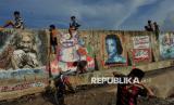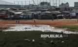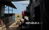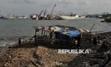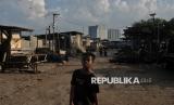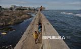 Warga beraktivitas di kawasan pesisir Muara Baru, Jakarta Utara, Jumat (3/1/2024). Wijaya (30) salah satu warga kampung Muara Baru menuturkan, pasalnya pada sekitar tahun 2002, kondisi pemukimannya berbada sekitar 35 meter dari bibir pantai sebelum dibangun tanggul, Namun, setiap tahun kondisi air laut naik dan permukaan tanah mengalami penurunan. Wijaya mengaku khawatir terkait turunnya permukaan air tanah tersebut. Sementara menurut Menteri Lingkungan Hidup Hanif Faisol Nurofiq mengatakan penurunan permukaan air tanah di Jakarta mencapai 39 sentimeter per tahun yang mana penyebab utamanya adalah penggunaan air tanah yang berlebihan. (FOTO : Republika/Thoudy Badai)
