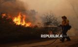 Petugas pemadam kebakaran berusaha memadamkan kebakaran besar yang melanda kawasan Pacific Palisades, Los Angeles, California, Selasa (7/1/2025) waktu setempat. Kebakaran hutan yang dipicu oleh angin kencang melanda lereng bukit Los Angeles, menghanguskan sedikitnya 770 hektare lahan termasuk permukiman warga. Kebakaran terus meluas akibat hembusan angin kencang. Evakuasi sedang dilakukan karena potensi ancaman terhadap nyawa dan harta benda. Sebanyak 30.000 orang dievakuasi akibat kebakaran tersebut yang saat ini terus meluas. (FOTO : AP Photo/Etienne Laurent)