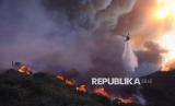 Helikopter menyiramkan air dalam upaya memadamkan kebakaran besar yang melanda kawasan Pacific Palisades, Los Angeles, California, Selasa (7/1/2025) waktu setempat. Kebakaran hutan yang dipicu oleh angin kencang melanda lereng bukit Los Angeles, menghanguskan sedikitnya 770 hektare lahan termasuk permukiman warga. Kebakaran terus meluas akibat hembusan angin kencang. Evakuasi sedang dilakukan karena potensi ancaman terhadap nyawa dan harta benda. Sebanyak 30.000 orang dievakuasi akibat kebakaran tersebut yang saat ini terus meluas. (FOTO : AP Photo/Etienne Laurent)