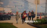 Warga berjalan untuk di evakuasi saat terjadi kebakaran besar yang melanda kawasan Pacific Palisades, Los Angeles, California, Selasa (7/1/2025) waktu setempat. Kebakaran hutan yang dipicu oleh angin kencang melanda lereng bukit Los Angeles, menghanguskan sedikitnya 770 hektare lahan termasuk permukiman warga. Kebakaran terus meluas akibat hembusan angin kencang. Evakuasi sedang dilakukan karena potensi ancaman terhadap nyawa dan harta benda. Sebanyak 30.000 orang dievakuasi akibat kebakaran tersebut yang saat ini terus meluas. (FOTO : REUTERS/Mike Blake)