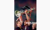 Pemain Ajax Amsterdam Patrick Kluivert mengangkat trophy usai menjadi juara Liga Champions mengalahkan AC Milan di pertandingan final di Stadion Ernst-Happel, Wina, Austria, Rabu (24/5/1995). Pelatih anyar timnas Indonesia Patrick Kluivert memiliki sederet prestasi mentereng saat masih aktif menjadi pesepak bola, salah satunya saat membawa Ajax Amsterdam menjadi juara Liga Champions di tahun 1995. (FOTO : Neal Simpson/PA Images via Reuters)