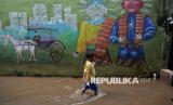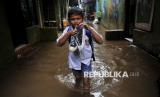 Siswa bejakan melewati yang terendam banjir di Kebon Pala II, Jakarta, Kamis (8/1/2025). Banjir setinggi sekitar 40-50 centimeter tersebut terjadi akibat intensitas curah hujan tinggi pada malam dini hari hingga pagi yang menyebabkan debit air Kali Ciliwung meluap hingga ke pemukiman warga. (FOTO : Republika/Thoudy Badai)