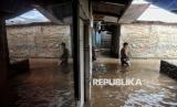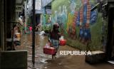 Warga beraktivitas di kawasan pemukiman yang terendam banjir di Kebon Pala II, Jakarta, Kamis (8/1/2025). Banjir setinggi sekitar 40-50 centimeter tersebut terjadi akibat intensitas curah hujan tinggi pada malam dini hari hingga pagi yang menyebabkan debit air Kali Ciliwung meluap hingga ke pemukiman warga. (FOTO : Republika/Thoudy Badai)
