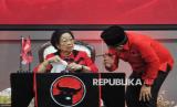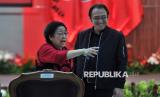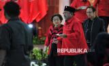 Ketua Umum PDI Perjuangan Megawati Soekarnoputri (kiri) bersama Ketua DPP PDIP Prananda Prabowo (kanan) usai menyampaikan pidato politiknya saat perayaan HUT ke-52 PDI Perjuangan di Sekolah Partai, Lenteng Agung, Jakarta Selatan, Jumat (10/1/2025). Dalam HUT ke-52 PDI Perjuangan yang mengangkat tema Satyam Eva Jayate dengan sub tema Api Perjuangan Nan Tak Kunjung Padam tersebut dihadiri oleh sejumlah elite partai PDIP seperti Ketua DPP PDIP Puan Maharani, Sekjen PDIP Hasto Kristiyanto, Ketua DPP PDIP Prananda Prabowo, Bendahara Umum DPP PDIP Olly Dondokambey hingga Gubernur dan Wakil Gubernur terpilih DKJ Jakarta Pramono Anung dan Rano Karno. Perayaan HUT tersebut digelar dengan memotong tumpeng dan pidato politik Ketua Umum PDIP Megawati Soekarnoputri. Dalam pidatonya, Megawati menyoroti Indonesia yang tak kunjung menjadi negara maju dan mencontoh negara China. (FOTO : Republika/Thoudy Badai)