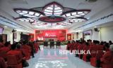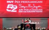 Ketua Umum PDI Perjuangan Megawati Soekarnoputri menyampaikan pidato politiknya saat perayaan HUT ke-52 PDI Perjuangan di Sekolah Partai, Lenteng Agung, Jakarta Selatan, Jumat (10/1/2025). Dalam HUT ke-52 PDI Perjuangan yang mengangkat tema Satyam Eva Jayate dengan sub tema Api Perjuangan Nan Tak Kunjung Padam tersebut dihadiri oleh sejumlah elite partai PDIP seperti Ketua DPP PDIP Puan Maharani, Sekjen PDIP Hasto Kristiyanto, Ketua DPP PDIP Prananda Prabowo, Bendahara Umum DPP PDIP Olly Dondokambey hingga Gubernur dan Wakil Gubernur terpilih DKJ Jakarta Pramono Anung dan Rano Karno. Perayaan HUT tersebut digelar dengan memotong tumpeng dan pidato politik Ketua Umum PDIP Megawati Soekarnoputri. Dalam pidatonya, Megawati menyoroti Indonesia yang tak kunjung menjadi negara maju dan mencontoh negara China. (FOTO : Republika/Thoudy Badai)