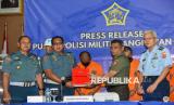 Kabag Pidum Sat Idik Puspomal Mayor Laut (PM) Bondan K.H. (kedua kiri) menyerahkan berkas perkara berikut tersangka pelaku penembakan pemilik rental mobil kepada perwira Seksi Pengolahan Perkara Otmil II-07 Jakarta Mayor CHK G. Rambe (kedua kanan) disaksikan Danpuspomal Laksda TNI Samista (kiri) dan Kepala Oditur Militer II-07 Jakarta Kolonel Kum Riswandono (kanan) saat konferensi pers di Markas Puspomal, Jakarta, Rabu (15/1/2025). Pusat Polisi Militer TNI Angkatan Laut (Puspomal) melimpahkan berkas perkara penembakan yang menyebabkan kematian pemilik rental mobil di Rest Area Km 45 Tol Tangerang-Merak kepada Oditur Militer II-07 Jakarta untuk segera disidangkan, dengan ketiga tersangka yang merupakan anggota TNI AL yakni Sertu AA, Sertu RH, dan Kelasi Kepala (KLK) BA. (FOTO : ANTARA FOTO/Indrianto Eko Suwarso)