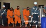 REPUBLIKA.CO.ID, JAKARTA -- Ketiga tersangka dikawal petugas saat konferensi pers pelimpahan berkas perkara dan penyerahan tersangka pelaku penembakan pemilik rental mobil dari Puspomal kepada Otidur Militer II-07 Jakarta di Markas Puspomal, Jakarta, Rabu (15/1/2025).