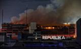 Kepulan asap dari gedung Glodok Plaza yang terbakar di Jakarta, Kamis (16/1/2025) dini hari. Sebanyak 44 mobil pemadam kebakaran dan 230 personel dikerahkan untuk memadamkan api yang menghanguskan bangunan Gedung Glodok Plaza. Kebakaran terjadi pada Rabu (15/1) sekitar pukul 21.22 WIB yang diduga bersumber dari diskotek di lantai tujuh. Hingga Kamis (16/1) dini hari sekitar pukul 02.33 WIB, kobaran api masih menyala didalam gedung Glodok Plaza. Dalam peristiwa ini, penyebab kebakaran masih diselidik oleh petugas dan laporan sementara tidak terdapat lorban jiwa dalam peristiwa tersebut. (FOTO : Republika/Thoudy Badai)