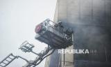 Petugas pemadam kebakaran dengan menggunakan sky life bersiap melakukan proses pendinginan setelah terjadi kebakaran di Glodok Plaza, Jakarta, Kamis (16/1/2025). Sebanyak 45 unit mobil dan 230 personil pemadam kebakaran dikerahkan ke lokasi kebakaran Glodok Plaza yang terjadi pada Rabu (15/1/2025) malam. Menurut data sementara hingga pukul 13.23 WIB hari ini, Tim gabungan berhasil mengevakuasi 9 orang korban selamat dan 7 orang masih dalam pencarian. (FOTO : Republika/Prayogi)