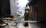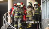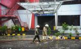 Petugas pemadam kebakaran berjalan keluar gedung usai melakukan proses pendinginan setelah terjadi kebakaran di Glodok Plaza, Jakarta, Kamis (16/1/2025). Sebanyak 45 unit mobil dan 230 personil pemadam kebakaran dikerahkan ke lokasi kebakaran Glodok Plaza yang terjadi pada Rabu (15/1/2025) malam. Menurut data sementara hingga pukul 13.23 WIB hari ini, Tim gabungan berhasil mengevakuasi 9 orang korban selamat dan 7 orang masih dalam pencarian. (FOTO : Republika/Prayogi)