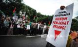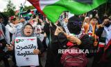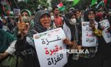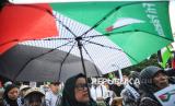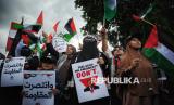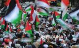 Pengunjuk rasa mengikuti aksi damai solidaritas untuk Palestina di depan Kedutaan Besar Amerika Serikat di Jakarta, Jumat (17/1/2025). Aksi bertajuk Gaza Menang tersebut digelar untuk merayakan kemenangan rakyat Palestina setelah disepakatinya gencatan senjata antara pejuang Hamas di Jalur Gaza dengan Zionis Israel. Kesepakatan gencatan senjata yang dimulai pada Ahad (19/1/2025) menandai berakhirnya agresi militer Israel yang telah berlangsung selama lebih dari 460 hari. (FOTO : Republika/Prayogi)