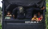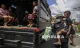 REPUBLIKA.CO.ID, HALMAHERA -- Sejumlah anak yang terdampak erupsi Gunung Ibu berada di atas truk Korps Brimob Polda Malut menuju lokasi pengungsian saat dievakuasi di Desa Togoreba Sungi, Kabupaten Halmahera Barat, Maluku Utara, Sabtu(18/1/2025).